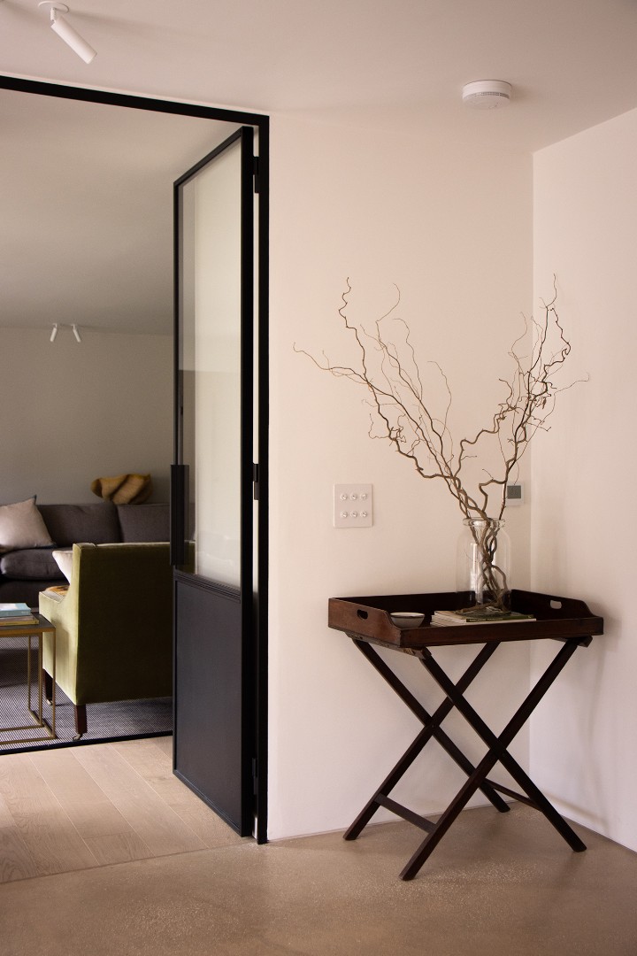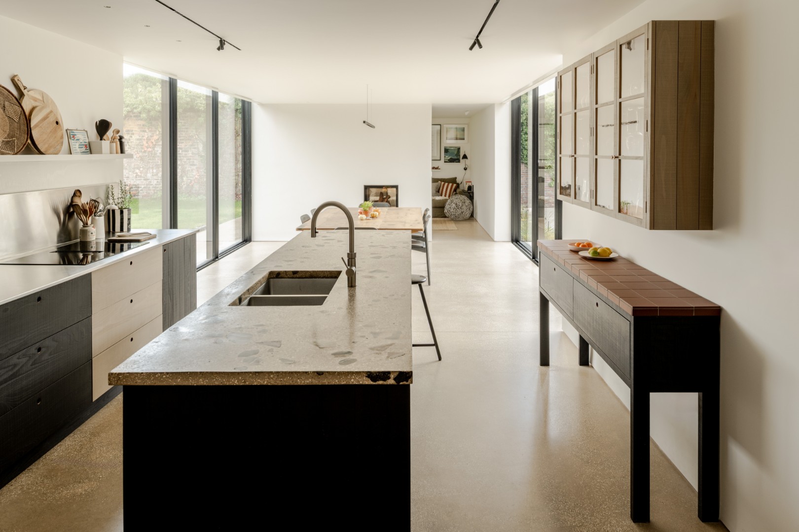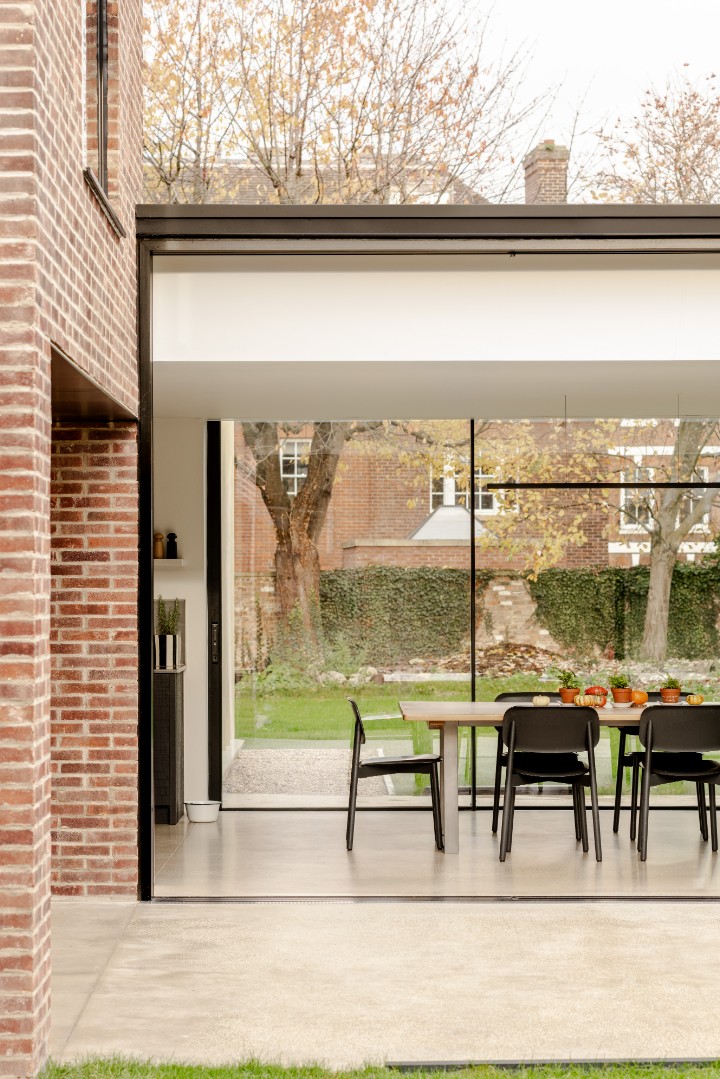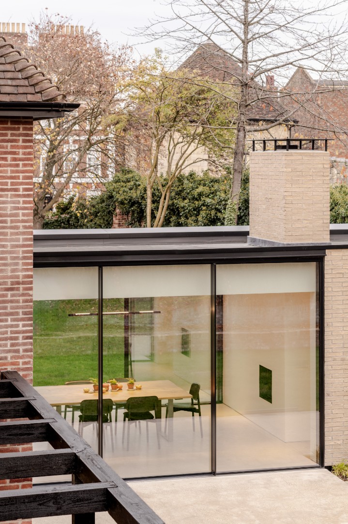 A new single storey extension extends out from the main house and wrapping around the side of the house, dividing the outside space into two areas of different character and providing living accommodation with full height glazing onto the gardens.