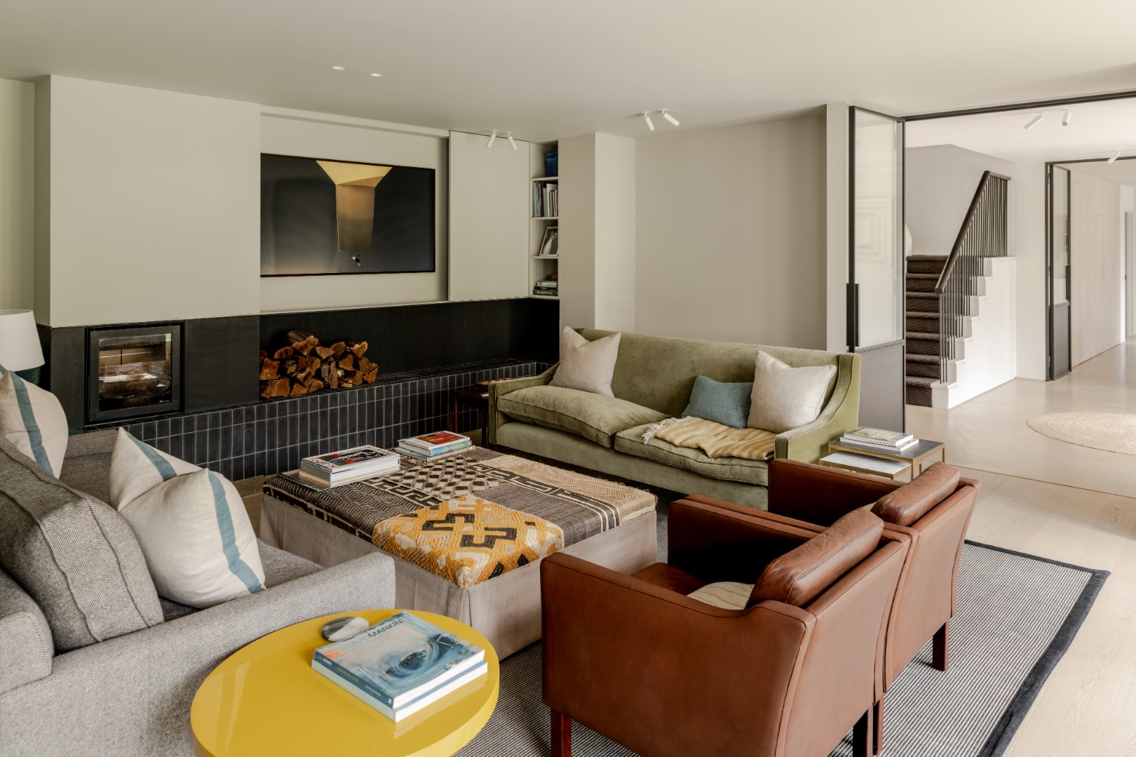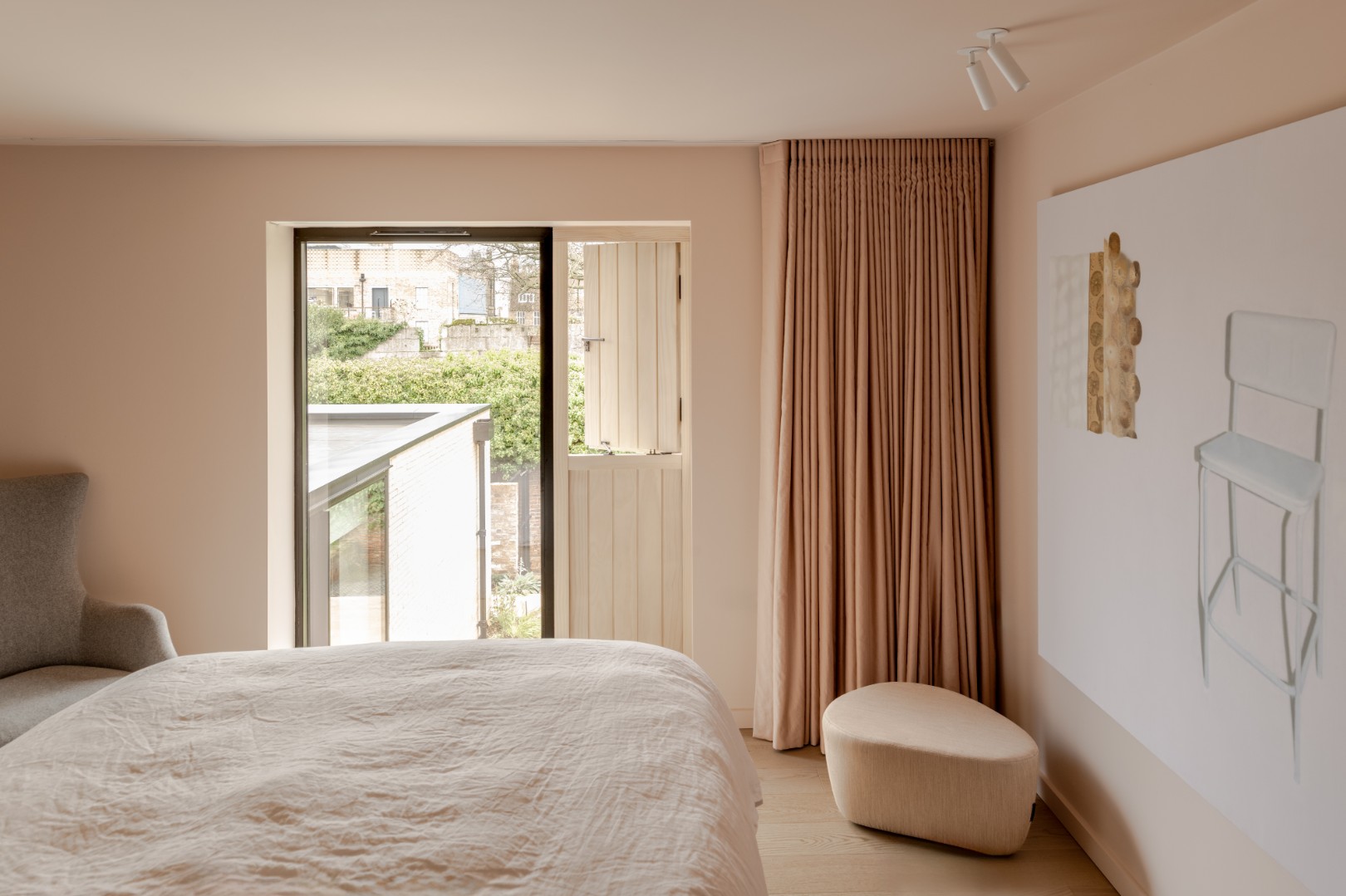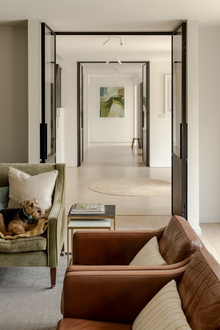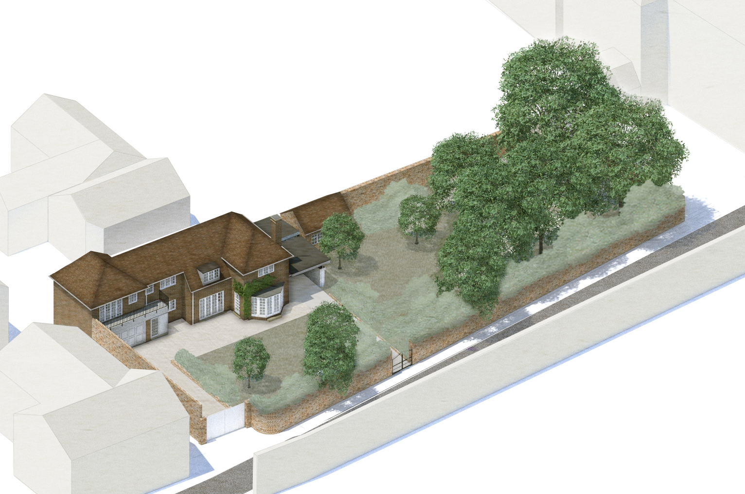 A new single storey extension extends out from the main house and wrapping around the side of the house, dividing the outside space into two areas of different character and providing living accommodation with full height glazing onto the gardens.