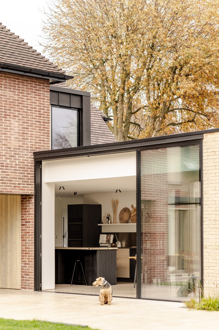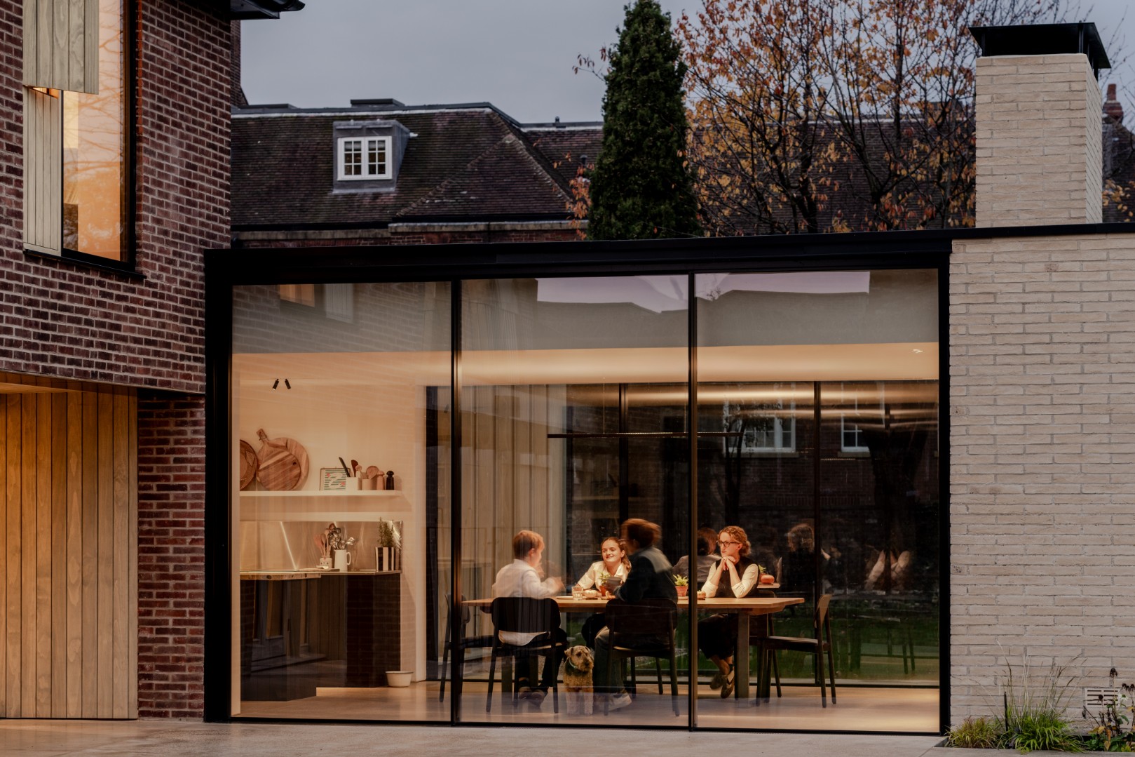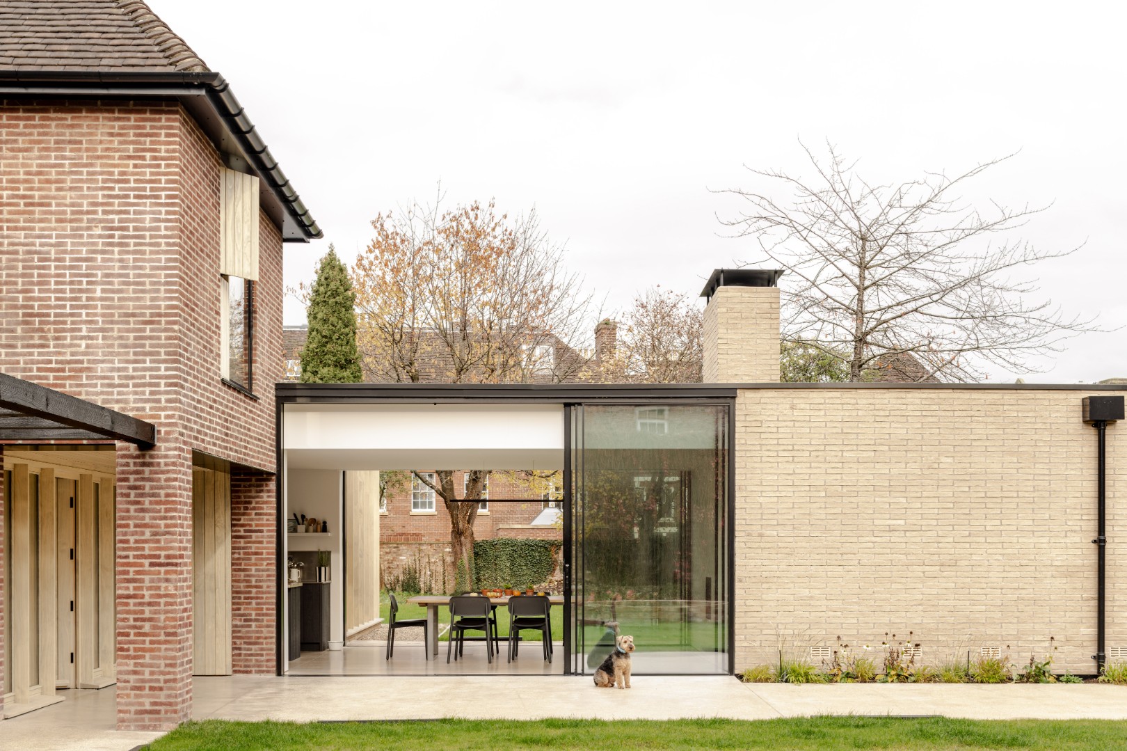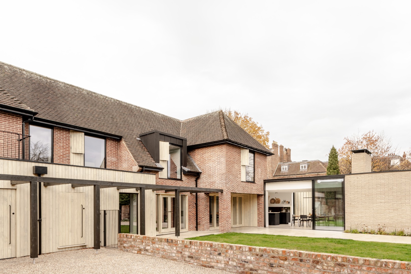 Alterations were carried out in a restrained palette of long format handmade bricks, vertical timber fins, and dark standing seam zinc.