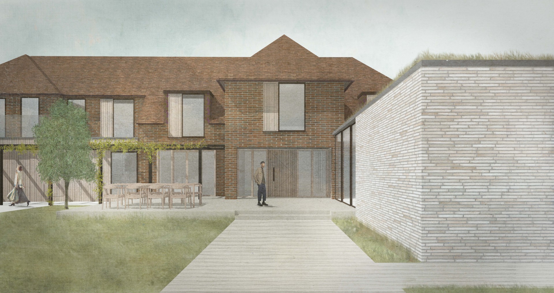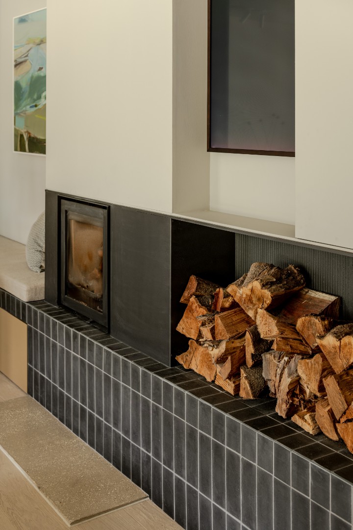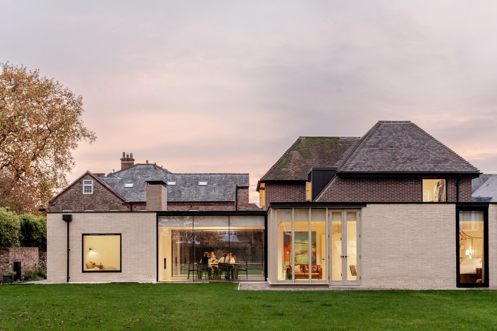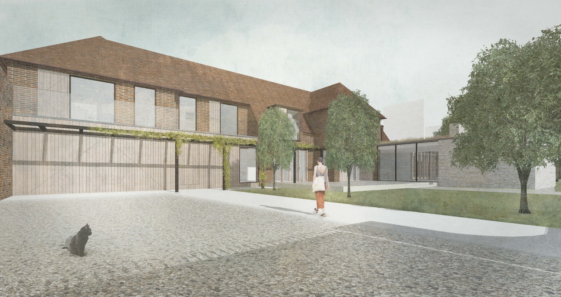Alterations were carried out in a restrained palette of long format handmade bricks, vertical timber fins, and dark standing seam zinc.