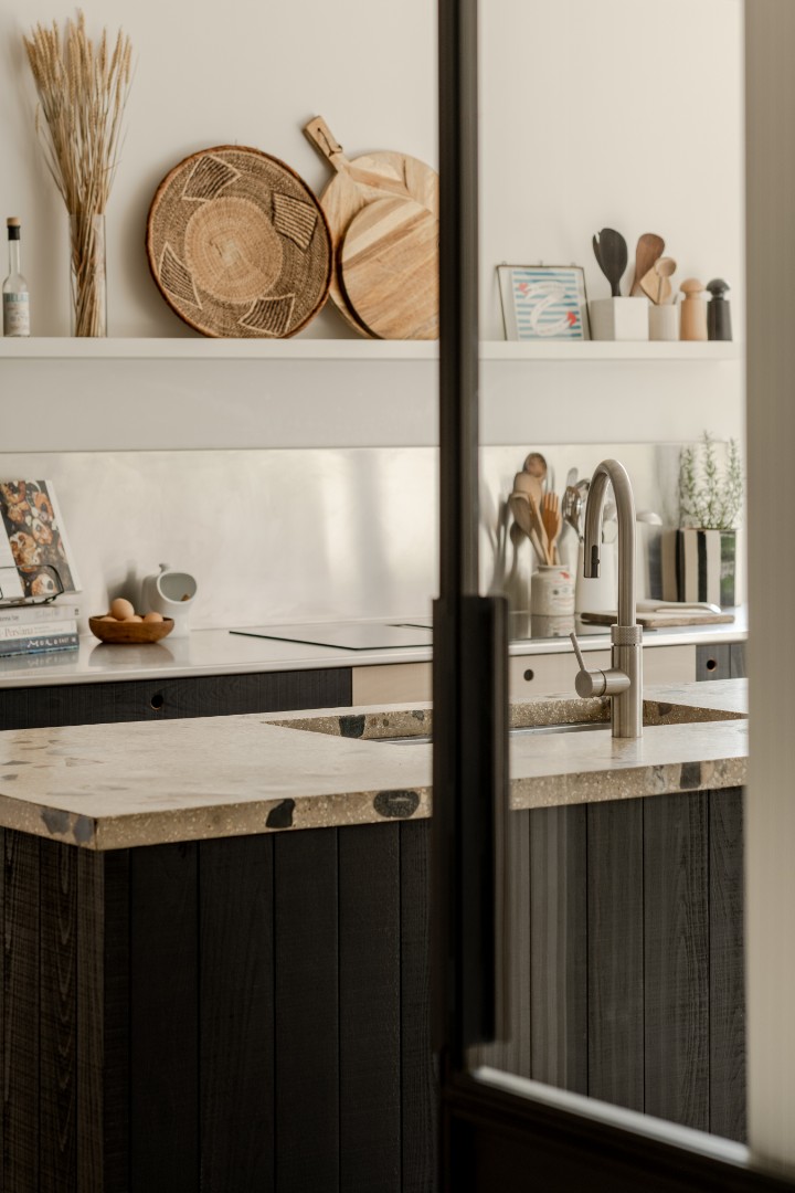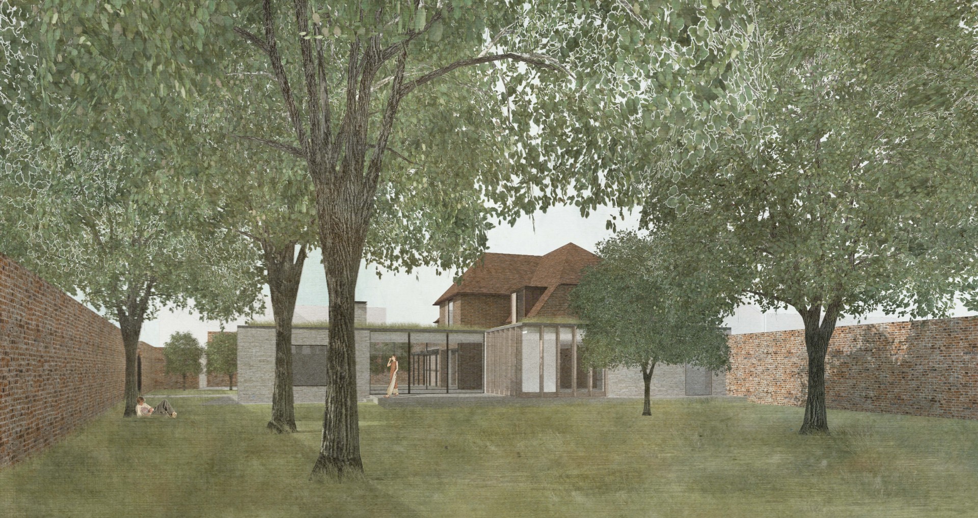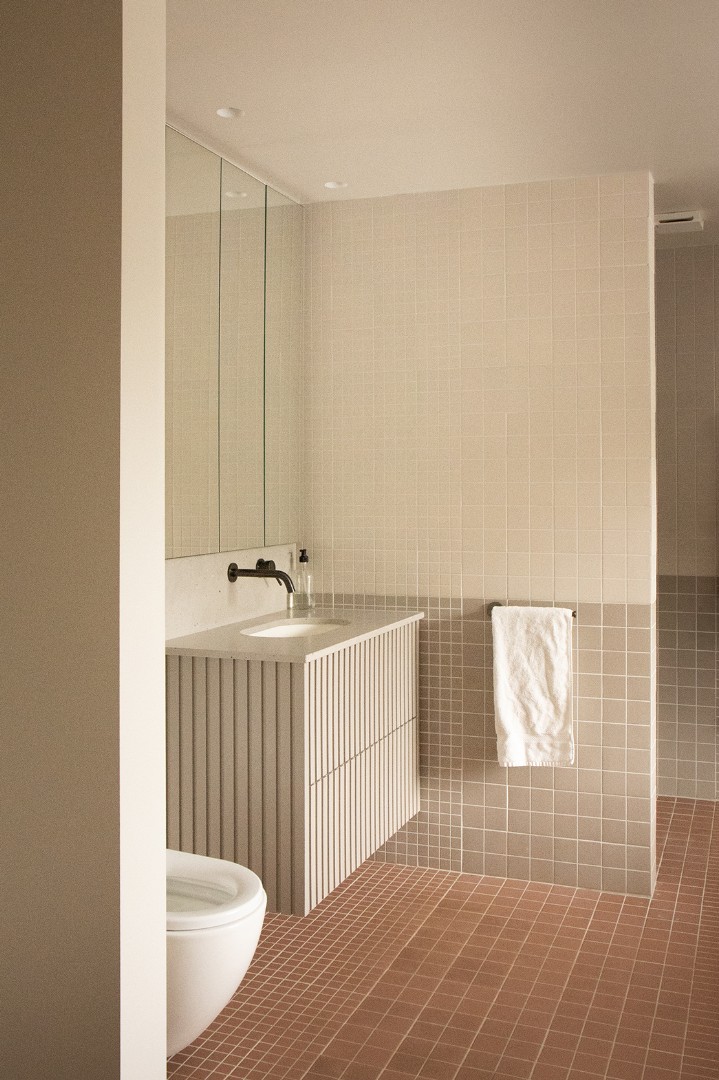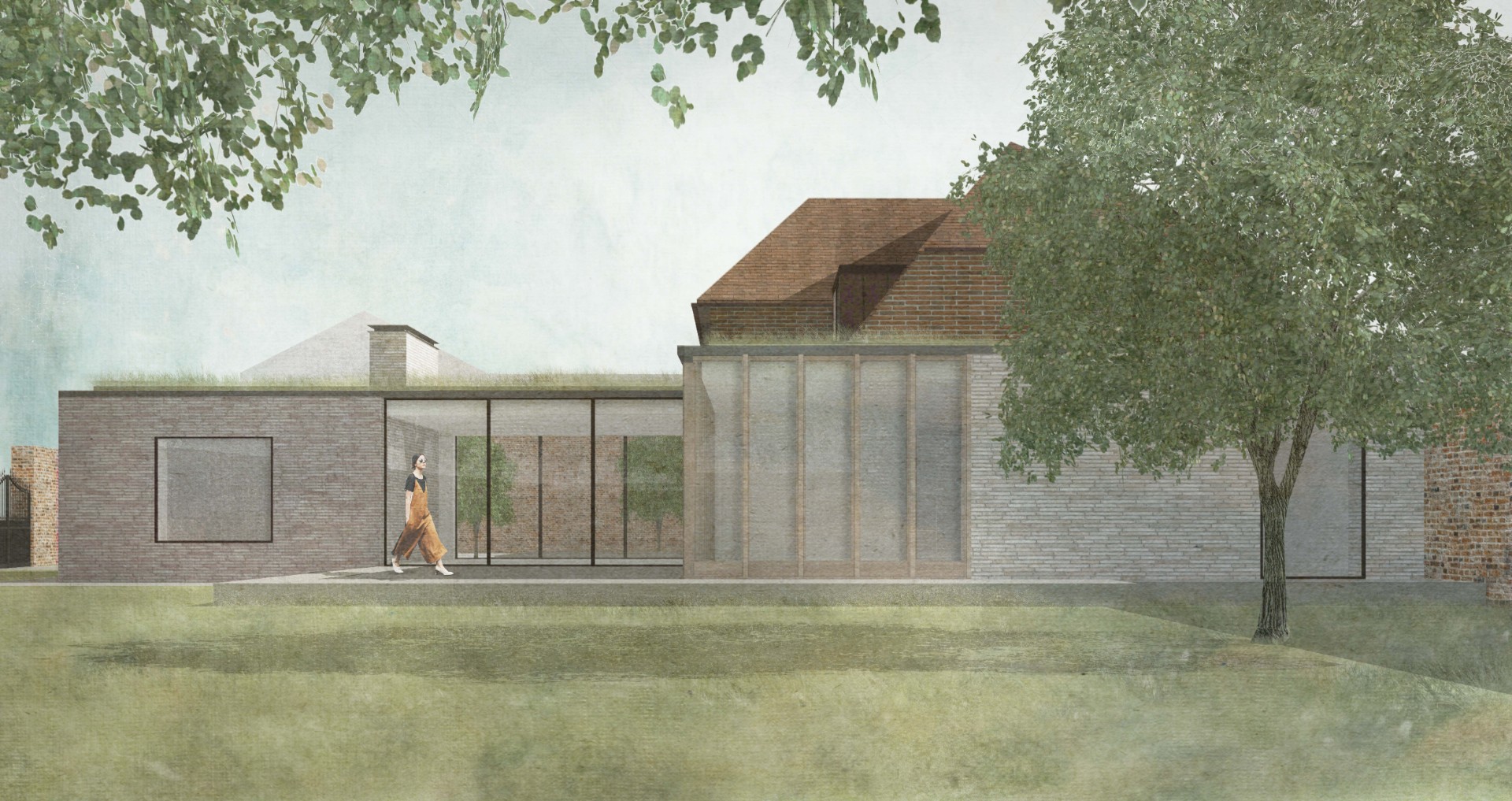 Alterations were carried out in a restrained palette of long format handmade bricks, vertical timber fins, and dark standing seam zinc.